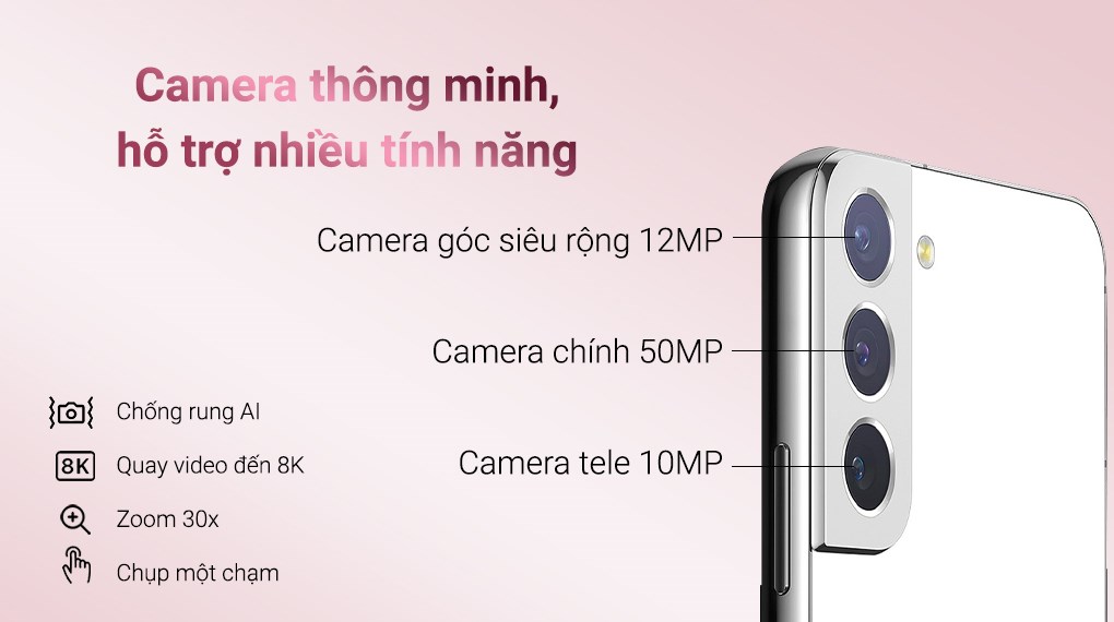 Galaxy S22 mang đến một bước tiến đáng kể về camera. Với camera selfie đục lỗ 10 MP, máy cho phép chụp những bức ảnh sắc nét và nổi bật, đồng thời tái hiện màu da chân thực. Phía sau, thiết bị được trang bị camera chính 50 MP, camera góc siêu rộng 12 MP và camera tele 10 MP, cung cấp khả năng chụp ảnh đa dạng trong nhiều điều kiện khác nhau.